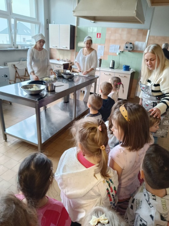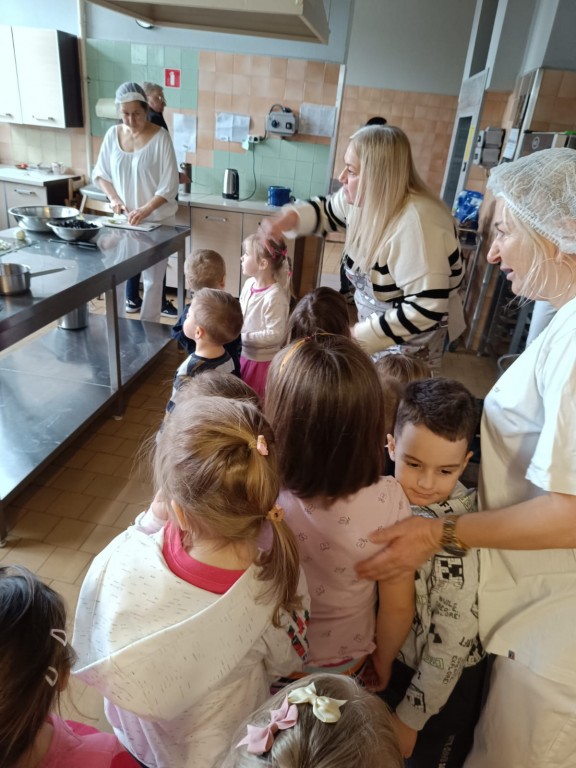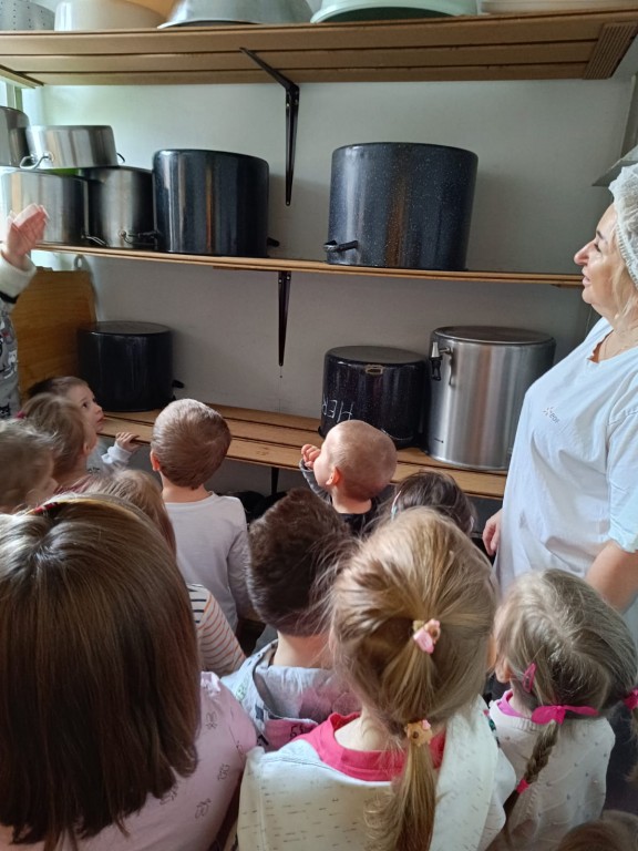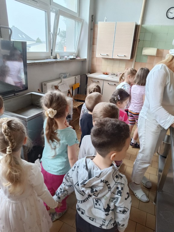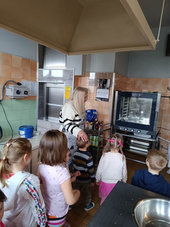 Grupa Motylki wybrała się na spacer edukacyjny do naszej przedszkolnej kuchni, pozwalający poznać pracę kucharek, nowoczesne sprzęty oraz zasady higieny i bezpieczenstwa przygotowywania posiłków.