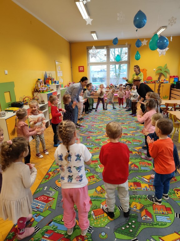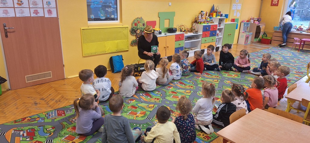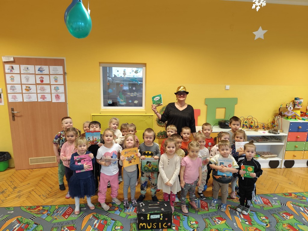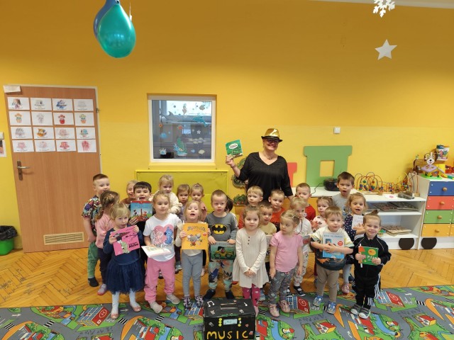 Pani Ola przeczytała dzieciom książeczki z bibliotecznej półeczki oraz zorganizowala dzieciom muzyczną niespodziankę. Dzieci z zainteresowaniem słuchały Pani Oli oraz chętnie uczestniczyły w zabawach ruchowych.